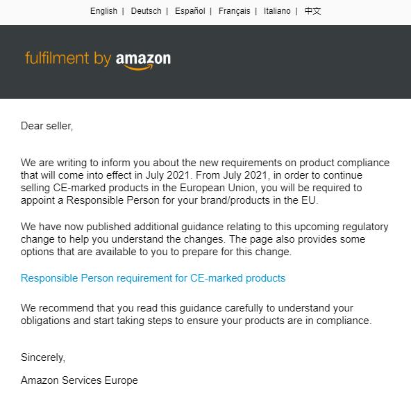 該新法規明確要求了歐盟境內CE標識商品的要求,目前有不少歐洲站的賣家都收到了亞馬遜的通知,主要內容為: